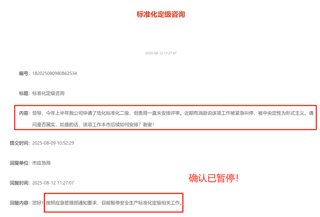 近日,在上海市应急管理局官方网站上,有企业咨询标准化定级的问题,下方回复明确表示: